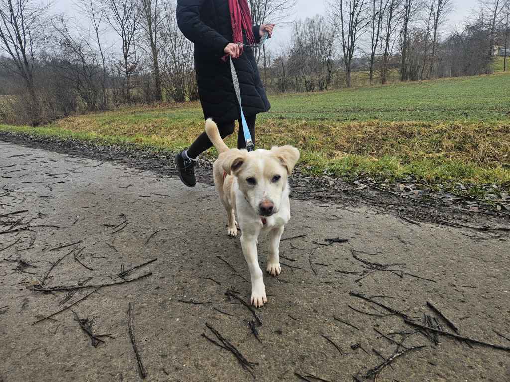 Draußen läuft er bereits völlig unproblematisch an der Leine, obwohl er offensichtlich noch nie eine um hatte. Schon im Laufe des ersten Spaziergangs gewöhnte er sich recht gut dran.