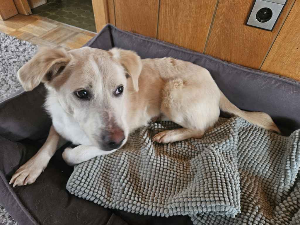 Was recht erstaunlich ist, ist die Tatsache, dass Maxi offenbar noch nie im Haus gewohnt hat. Anfang verunsicherte es ihn sehr sobald es vom Spaziergang ins Haus ging und er lag fast nur auf dem ihm zugewiesenen Platz. Inzwischen fängt er an die ersten Räume zu erkunden. Er wäre wohl schon weiter, wenn wir nicht so glatte Böden hätten, auf die er noch nicht möchte.